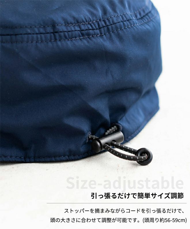 被ったままサイズ調節ができるゴム仕様。