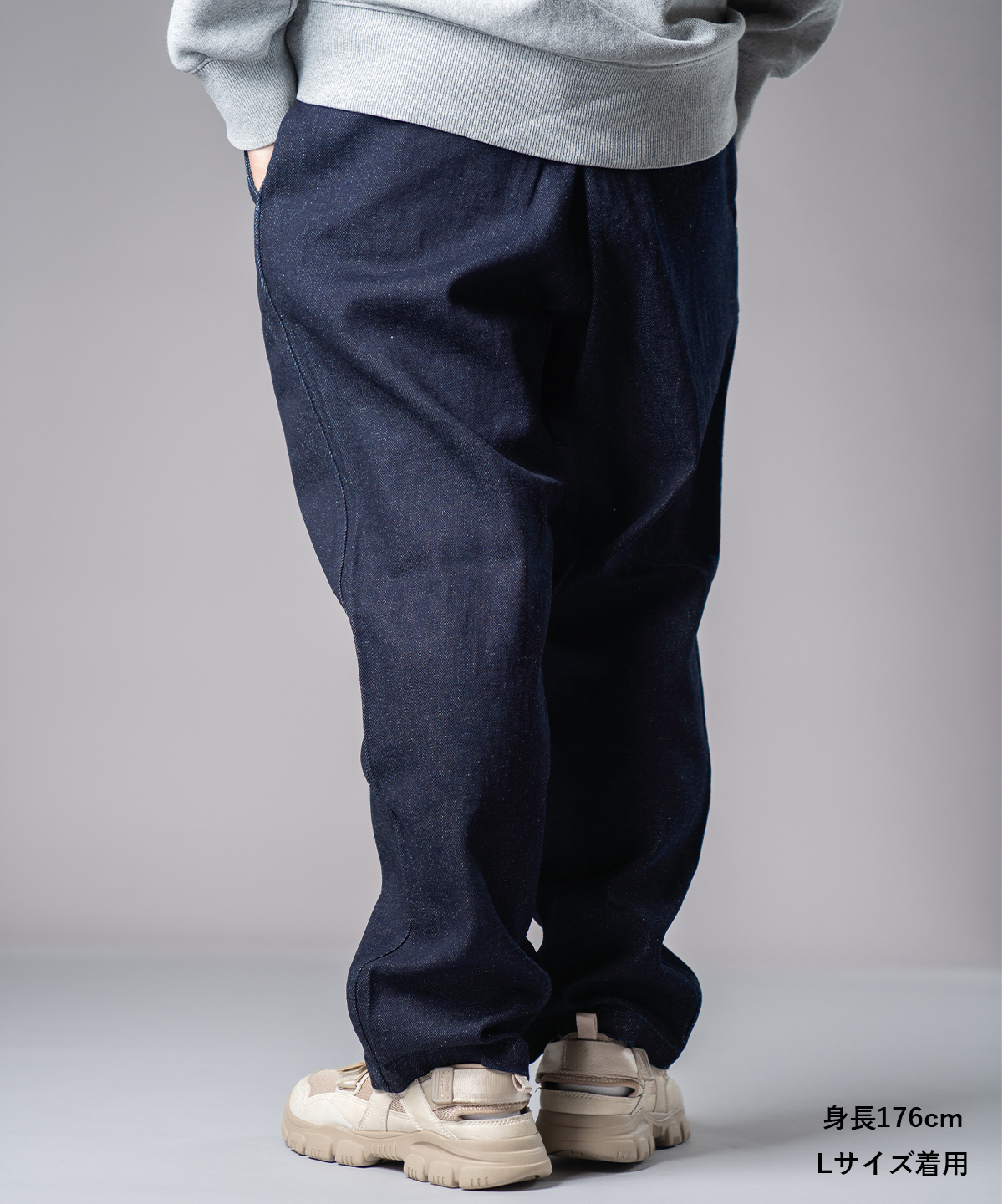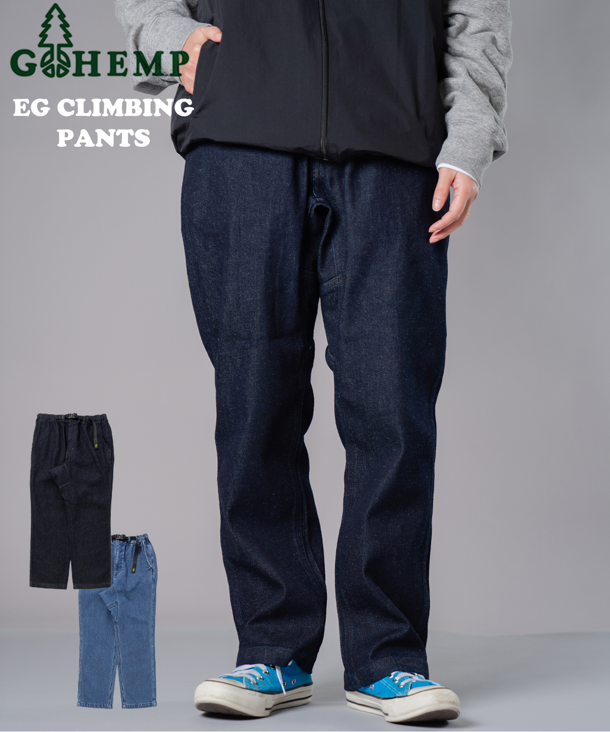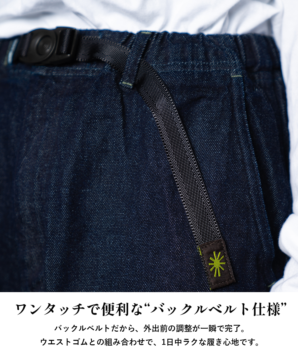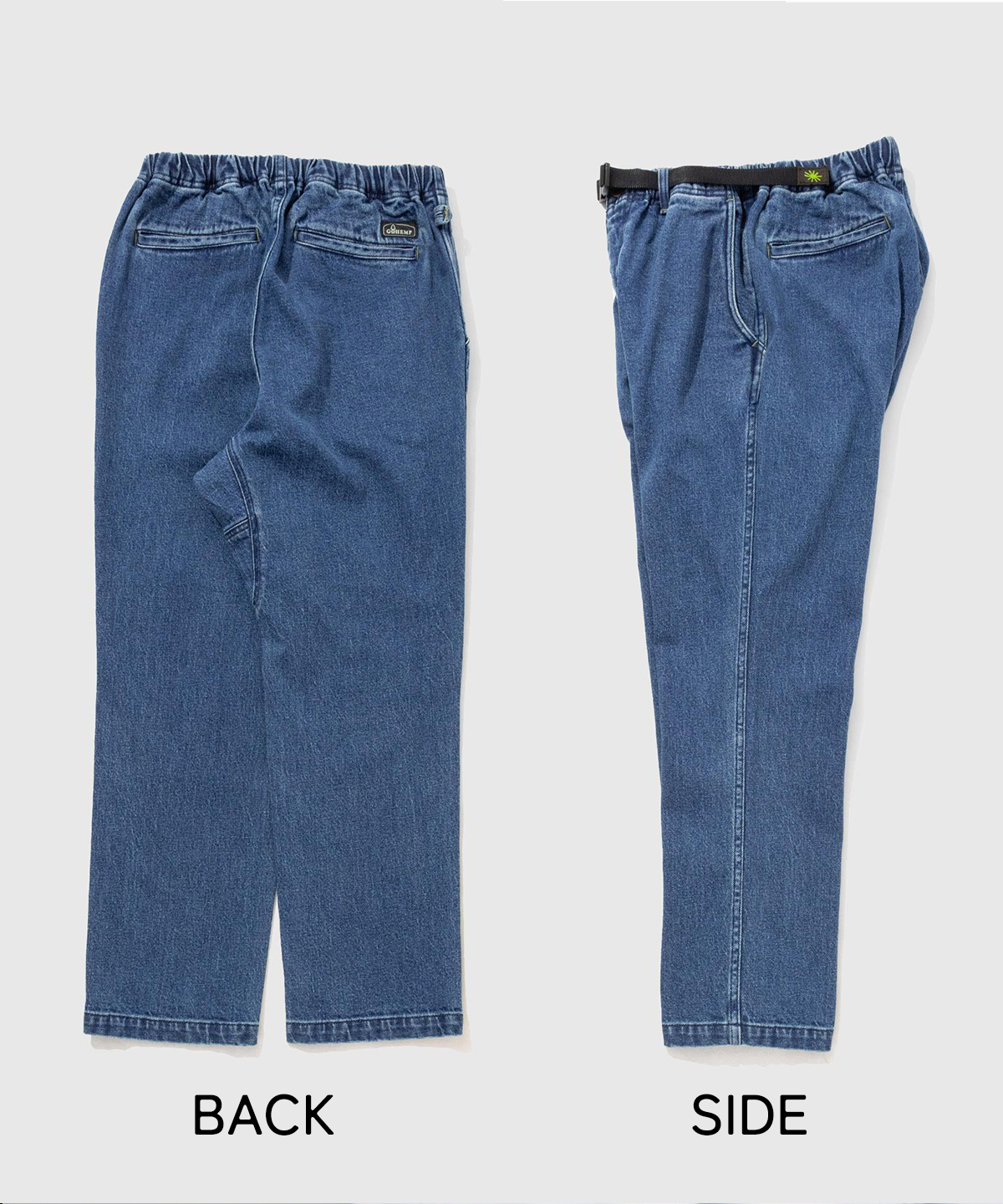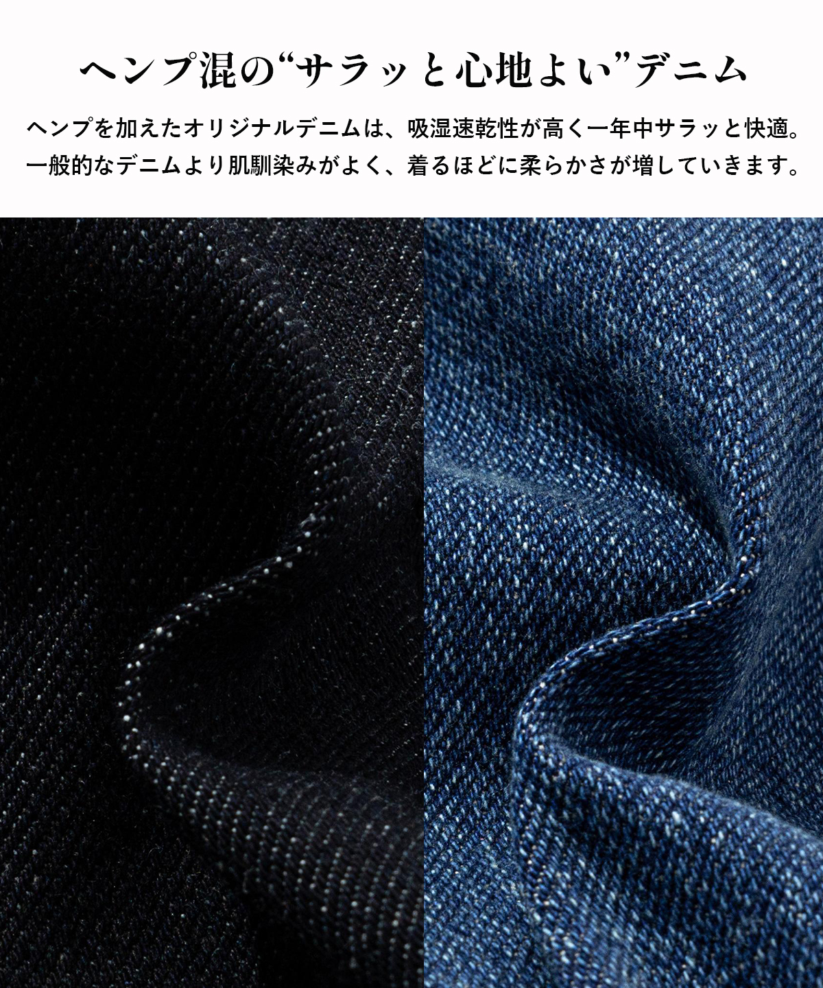 ヘンプ混デニムのサラッとした肌触りが、一年中快適な履き心地を叶える。