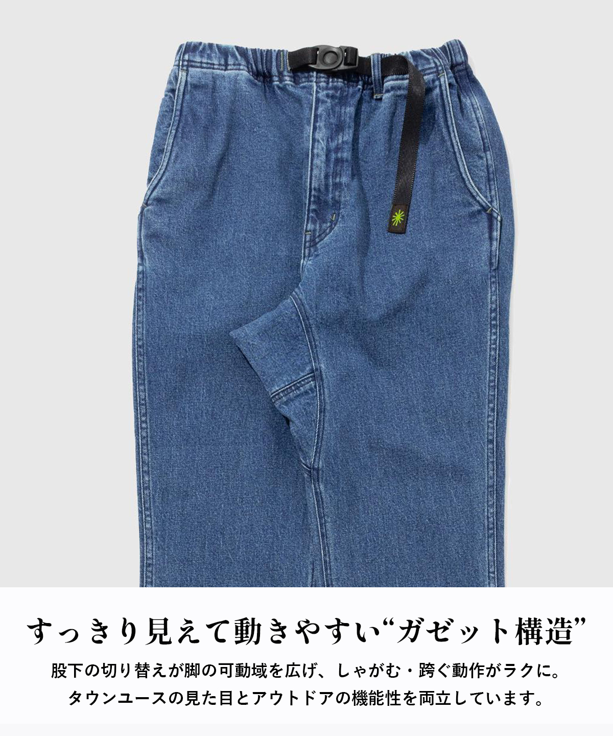 股下のガゼットで脚運びが軽く、自転車・アウトドア・街歩きまでストレスなし。