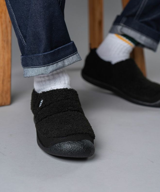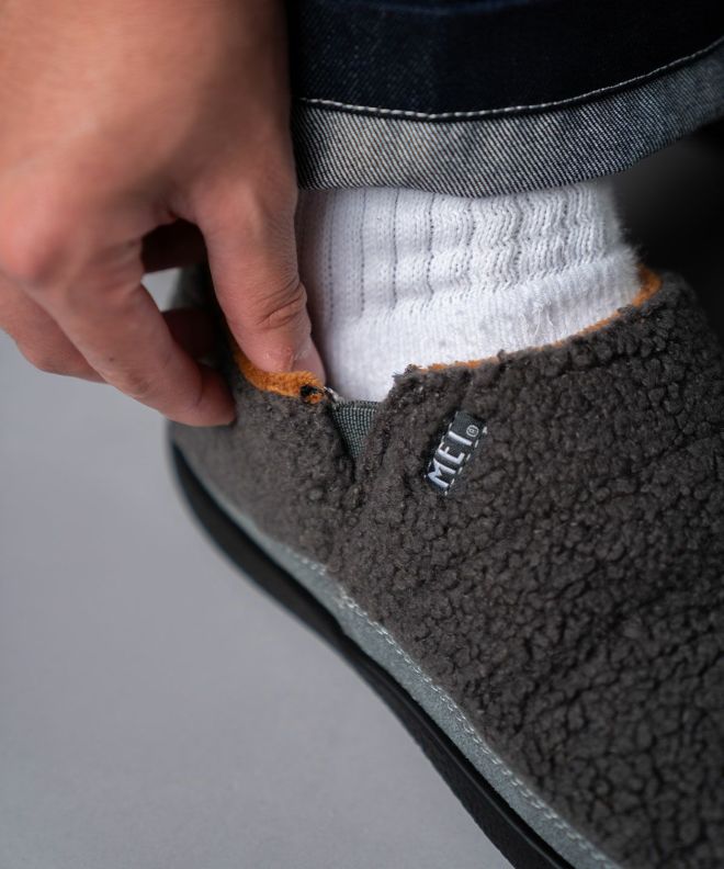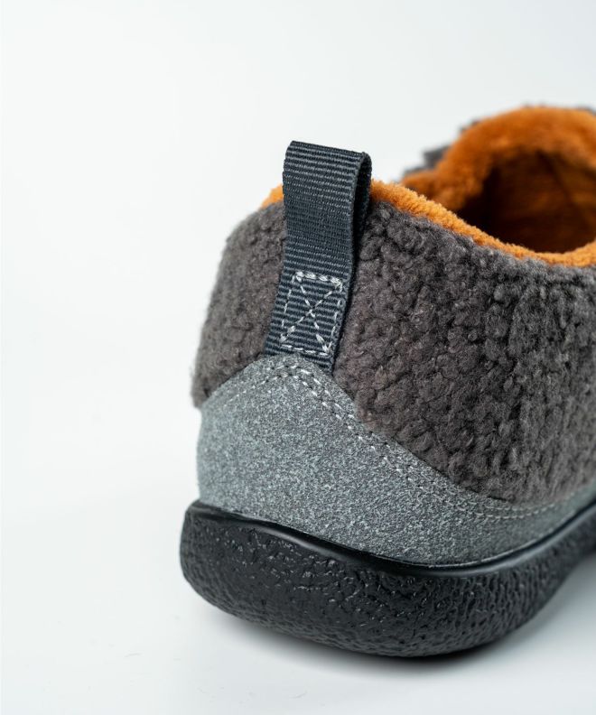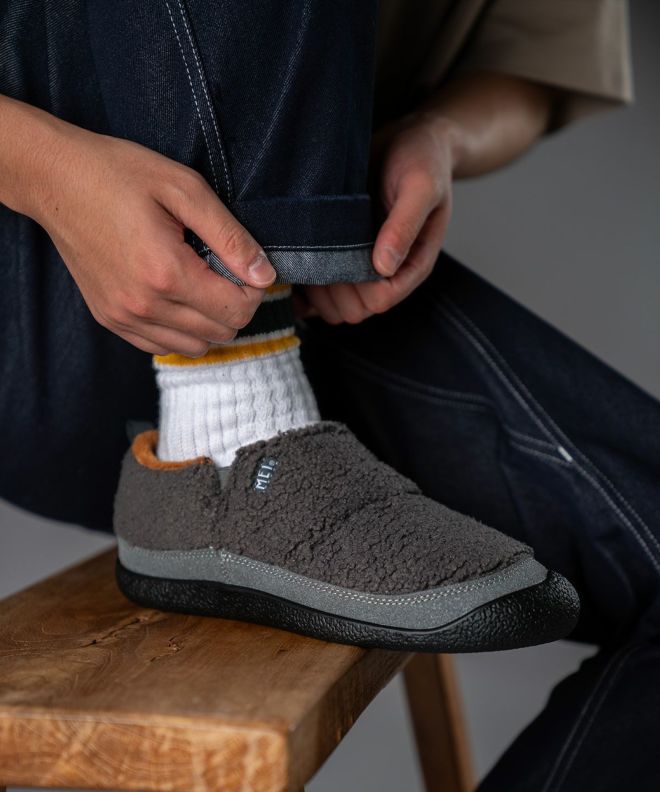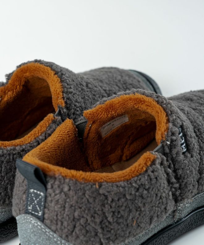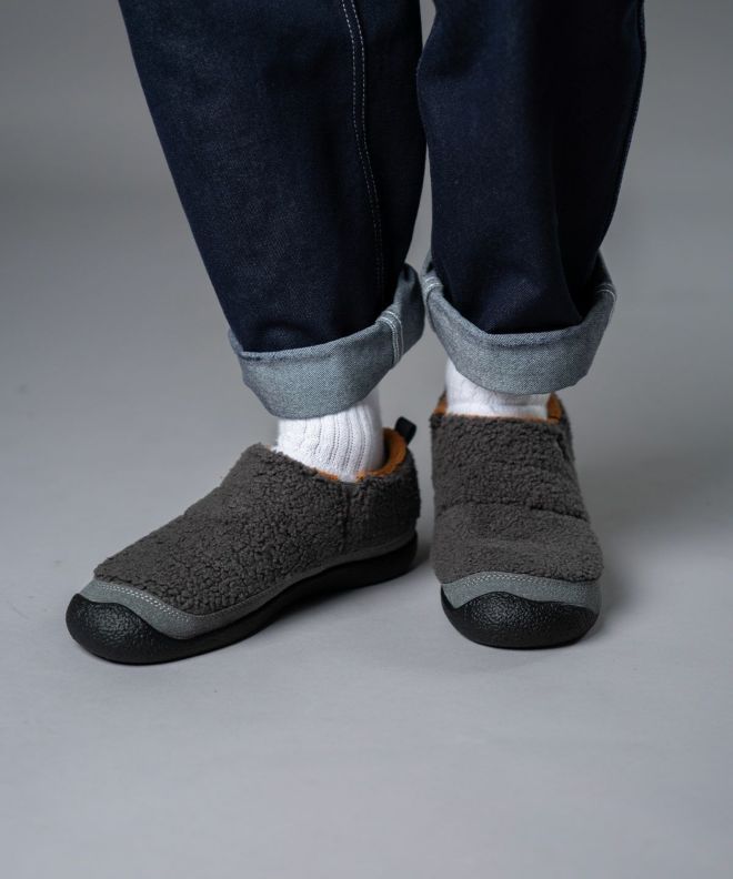 落ち着きのあるスウェード風のアッパーと、内側の毛足が短いボアフリースが足を包み込み、ふんわりとした温もりと快適さを両立します。