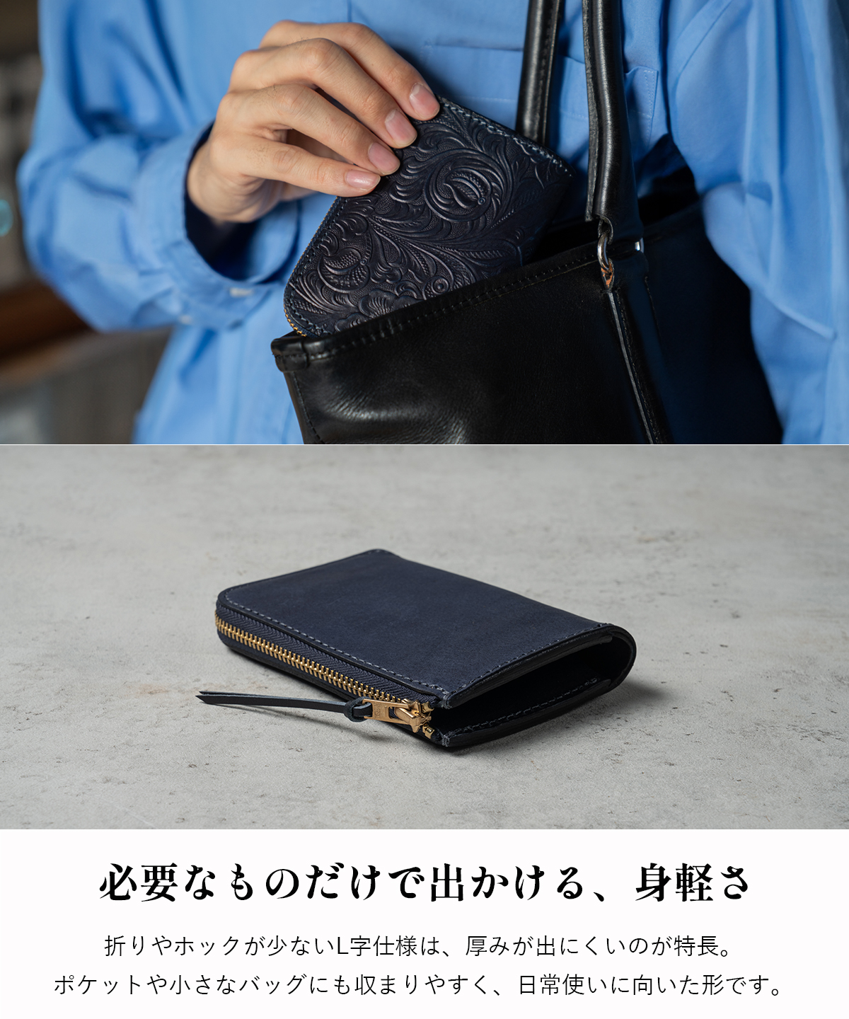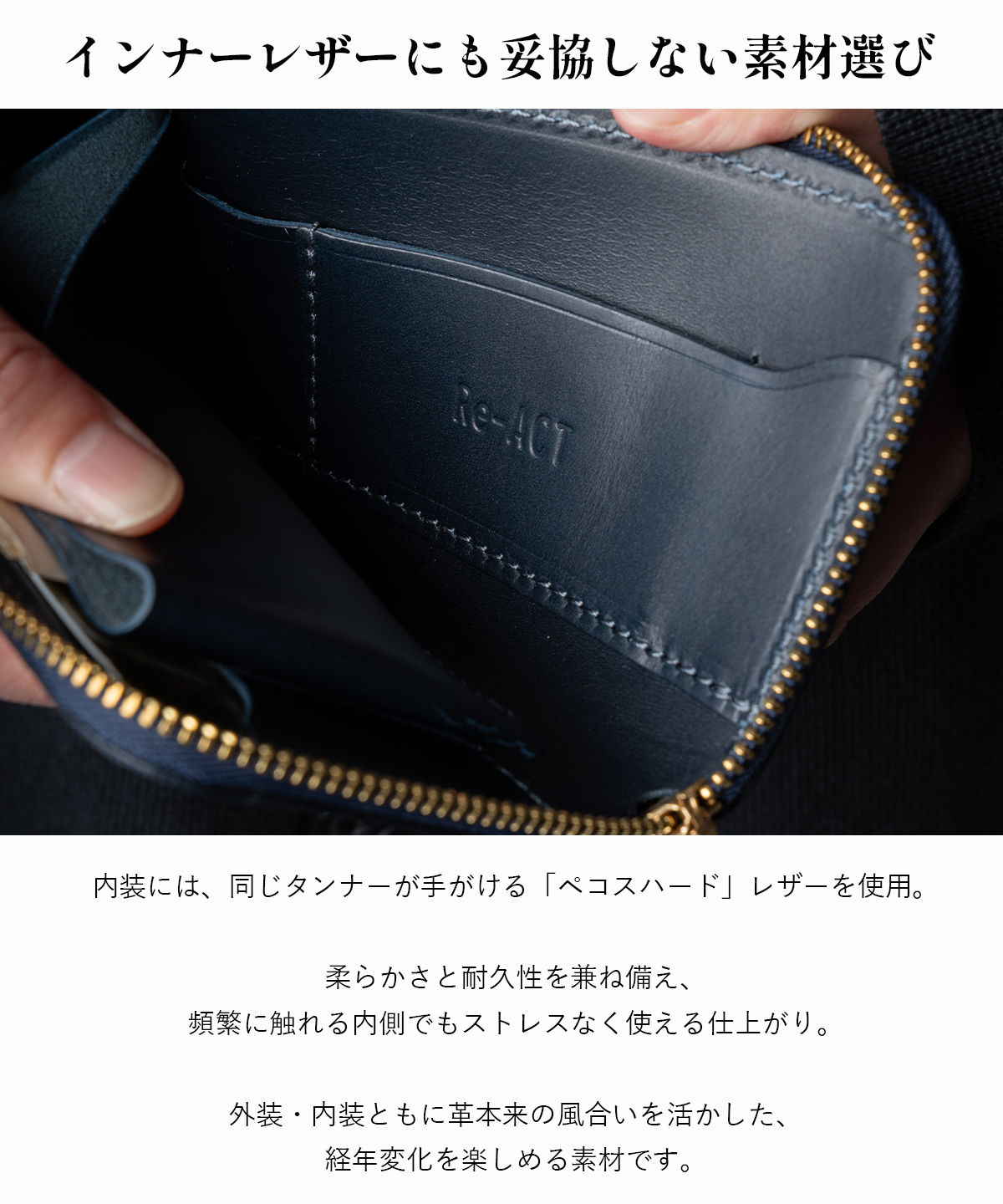 革には、使い込むほどに表情が深まるイタリア産植物タンニンなめしレザーを使用。