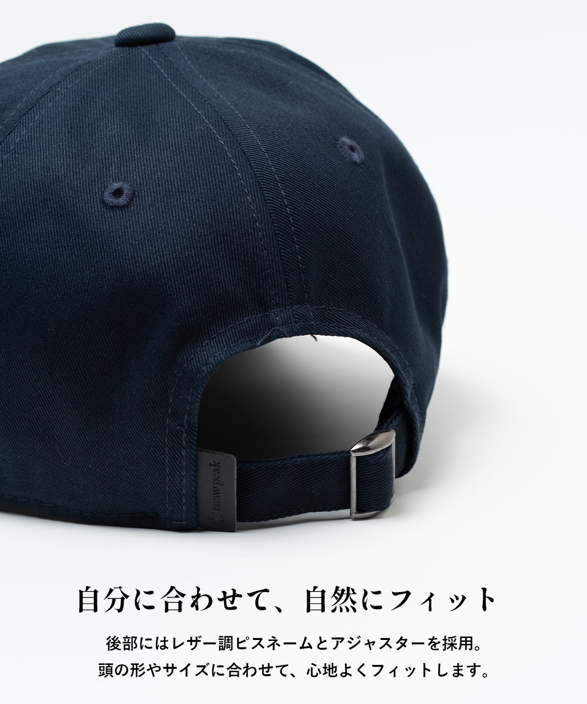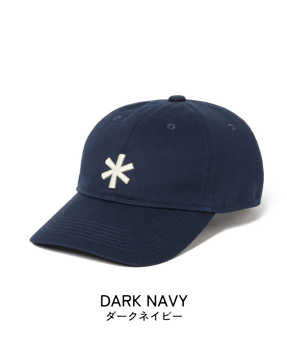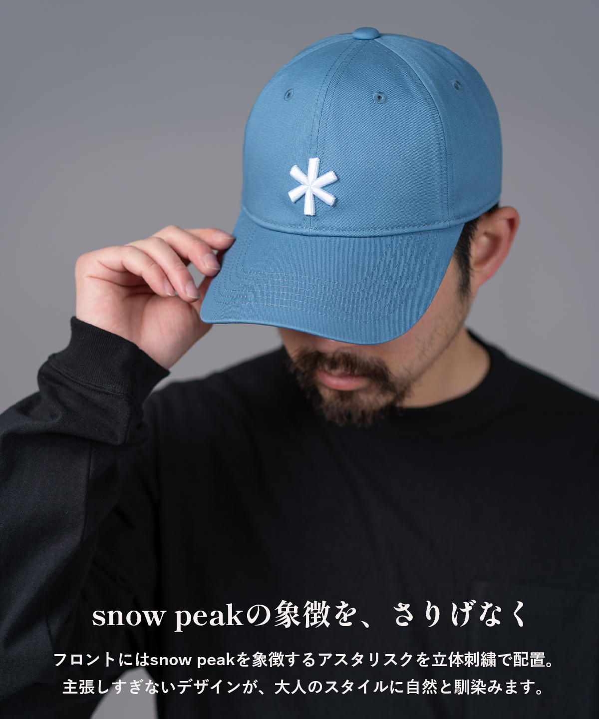snow peakを象徴するアスタリスクを、立体刺繍でさりげなく配置した6パネルキャップ。